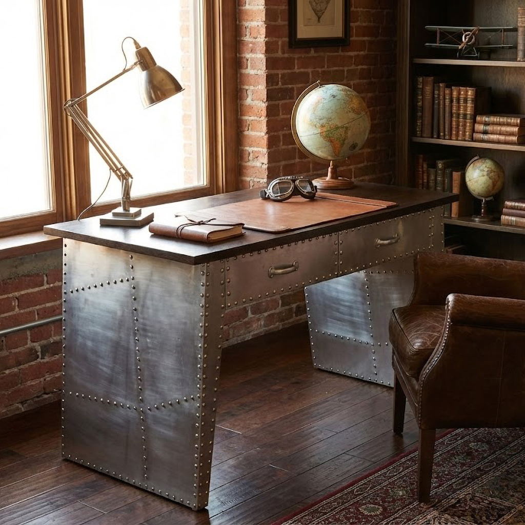 Varje detalj på Skrivbord Tomcat Aviator är utformad med noggrannhet och precision. De nitade aluminiumdetaljerna ger en autentisk känsla av flygets guldålder, medan träbordsskivan ger en varm och inbjudande känsla. Det här är inte bara ett skrivbord, det är en möbel som kommer att ta ditt hemmakontor till en helt ny nivå.