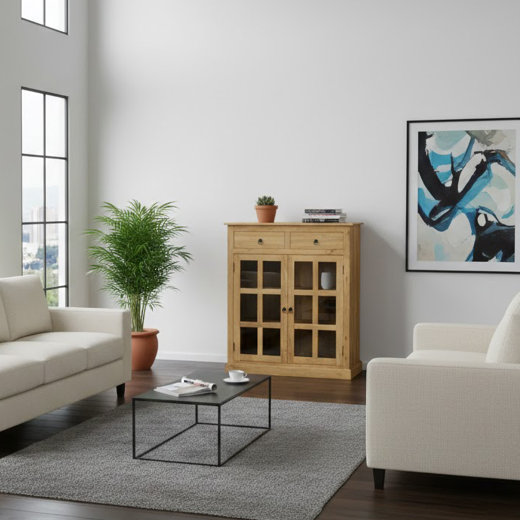 Indisk skänk i massivt akaciaträ, två lådor och två dörrar. Träspröjs framför glasdörrarna, klarglas. Ett fast hyllplan bakom dörrarna. Handtag i svart metall.