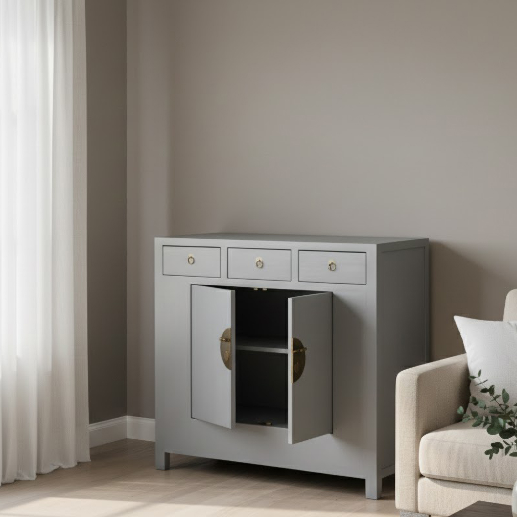 Kinaskänk Grå med två dörrar och tre lådor. Ett löstagbart hyllplan bakom dörrarna.
