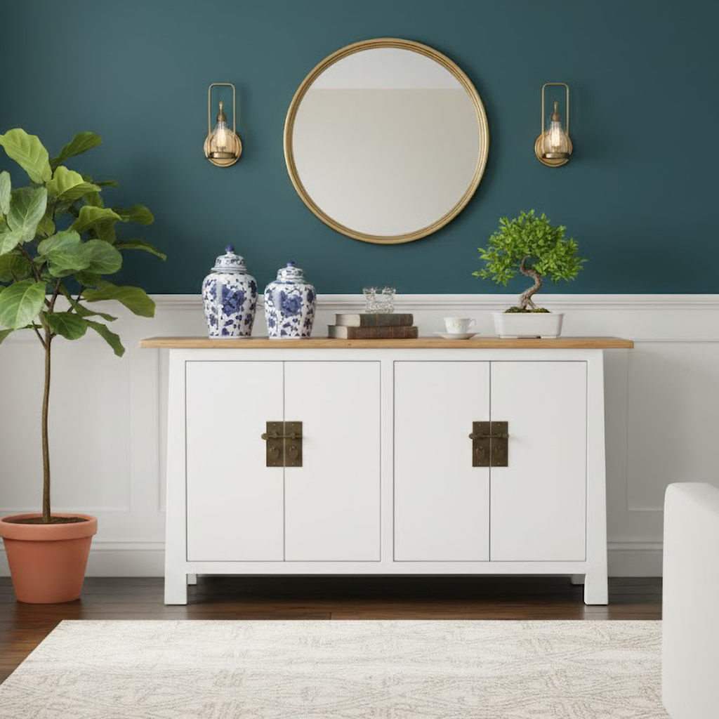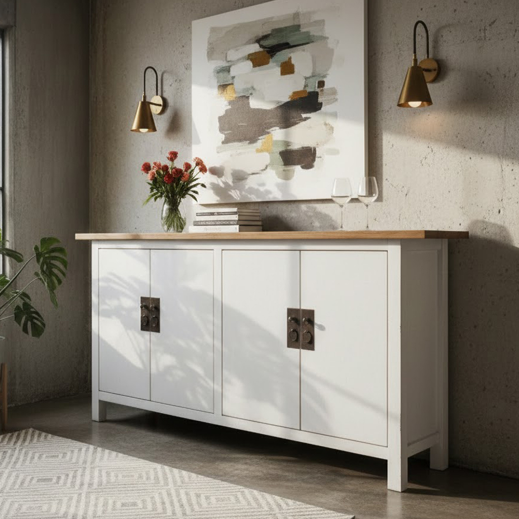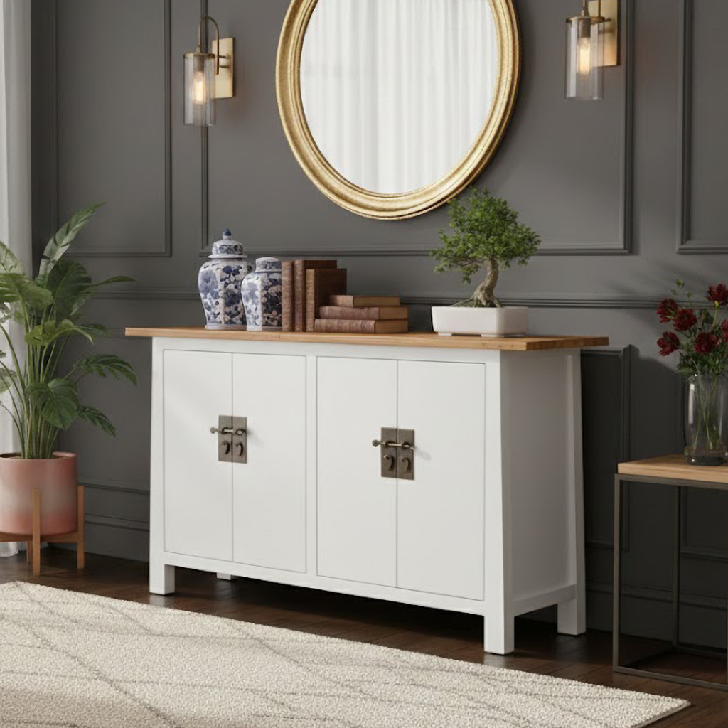 Skänk Kam är en vit skapelse som bär på en känsla av asiatisk prakt och funktionalitet. Med fyra eleganta dörrpar och ett löstagbart hyllplan bakom varje dörrpar, erbjuder den en perfekt balans mellan förvaring och design.