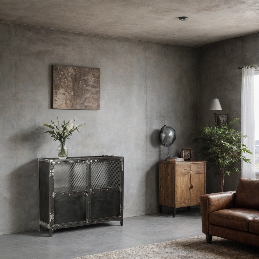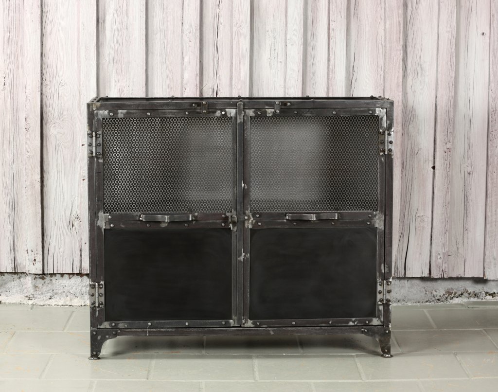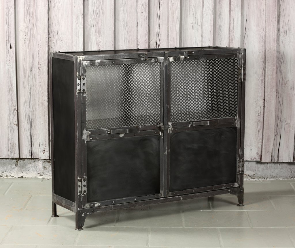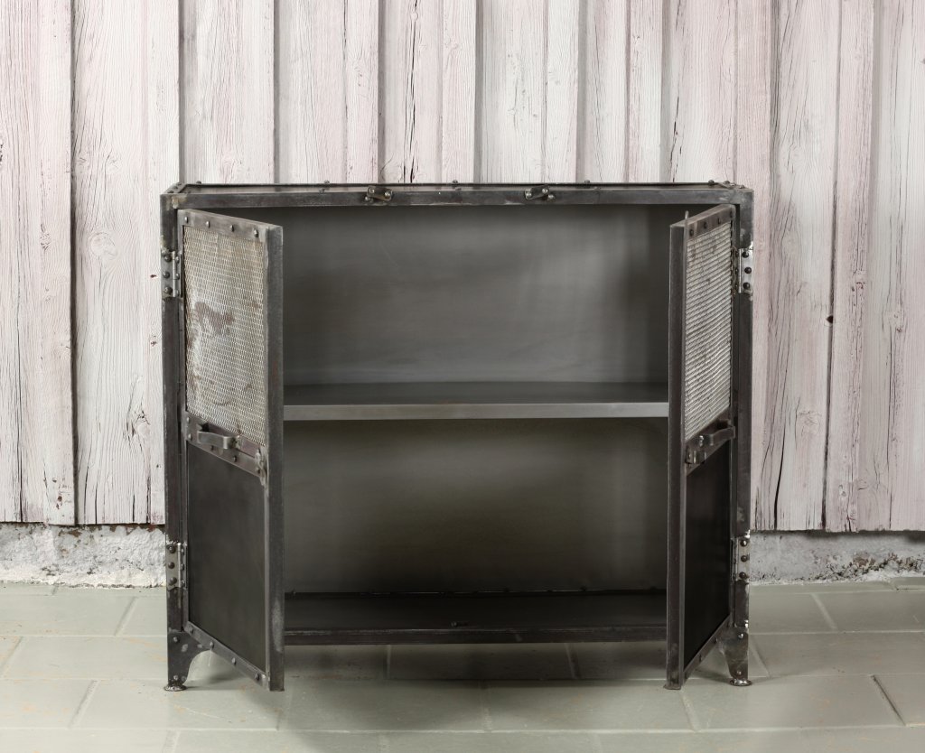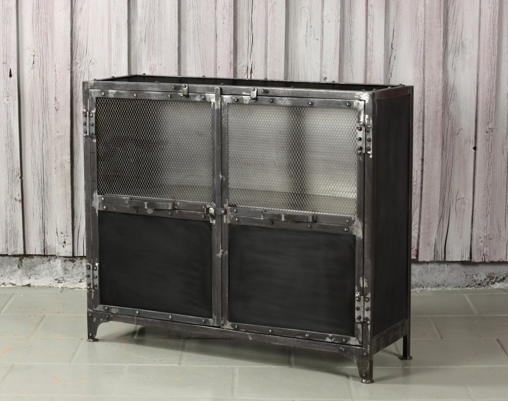 Grund skänk industriell stil tillverkad i metall. Utvändiga gångjärn och låsbeslag. Två dörrar, metallnät på övre delen av dörrarna. Två hyllplan i plåt innanför dörrarna.