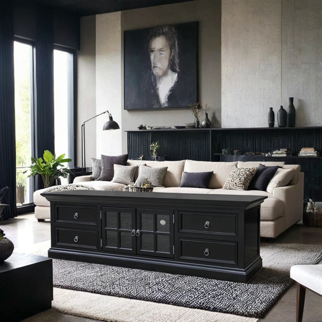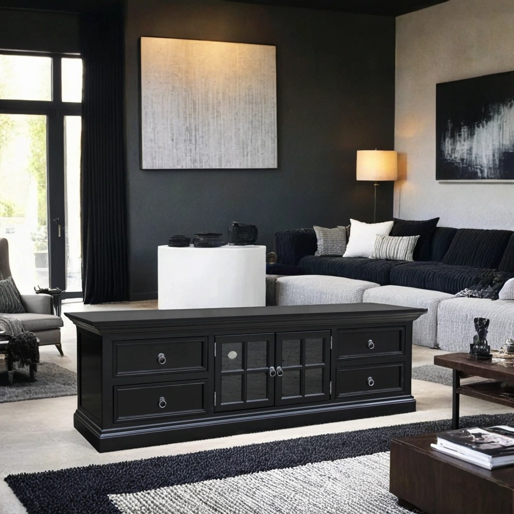 Med en storlek på 180x50x56cm har Halvik massor av förvaringsutrymme med två lådor på vänster och två på höger sida. De klarglasade dörrarna och spröjsen framför dem tillför en viss stilmedvetenhet, medan det silversvarta metallhandtaget lägger till en fin touch.