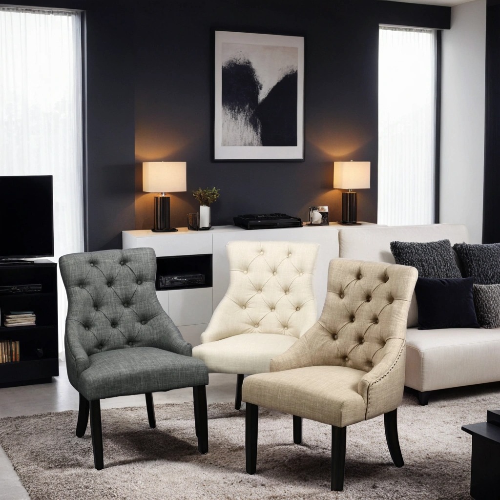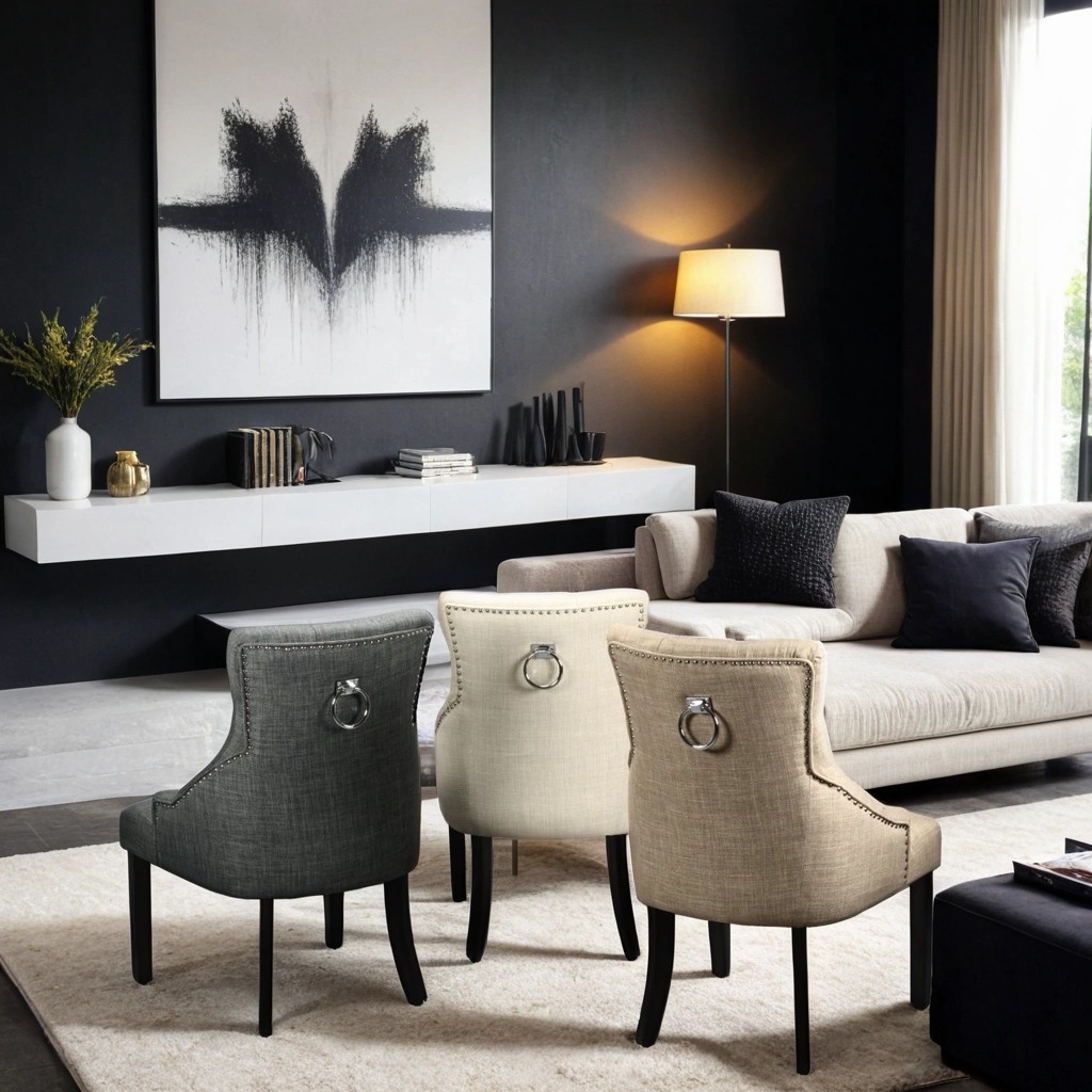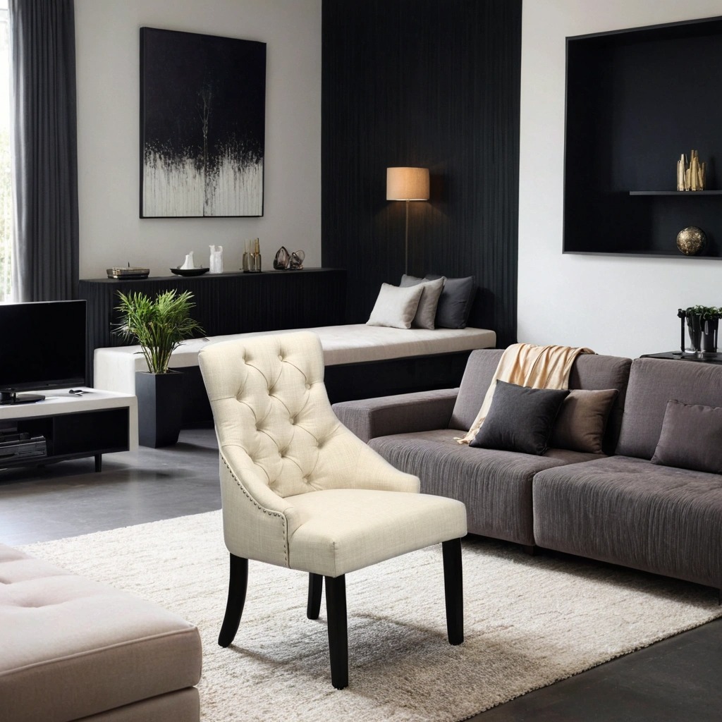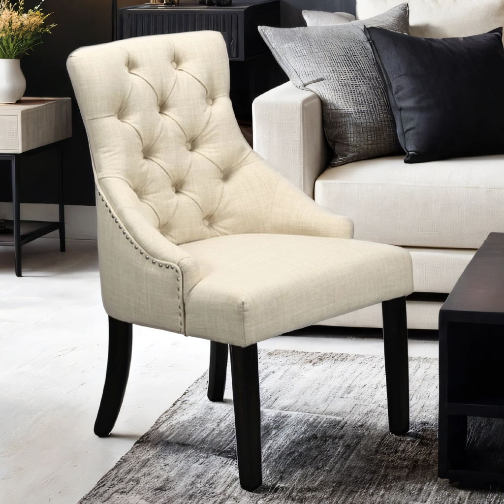 Kristina fåtölj har en klassisk design med en knappklädd rygg och elegant ringbeslag på baksidan. De vinklade benen ger en modern twist till den traditionella designen. Fåtöljen är enkel att montera och passar lika bra som en fristående fåtölj i hallen, sovrummet eller som en rejälare matstol runt matbordet.