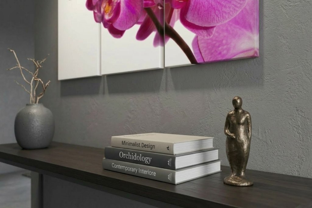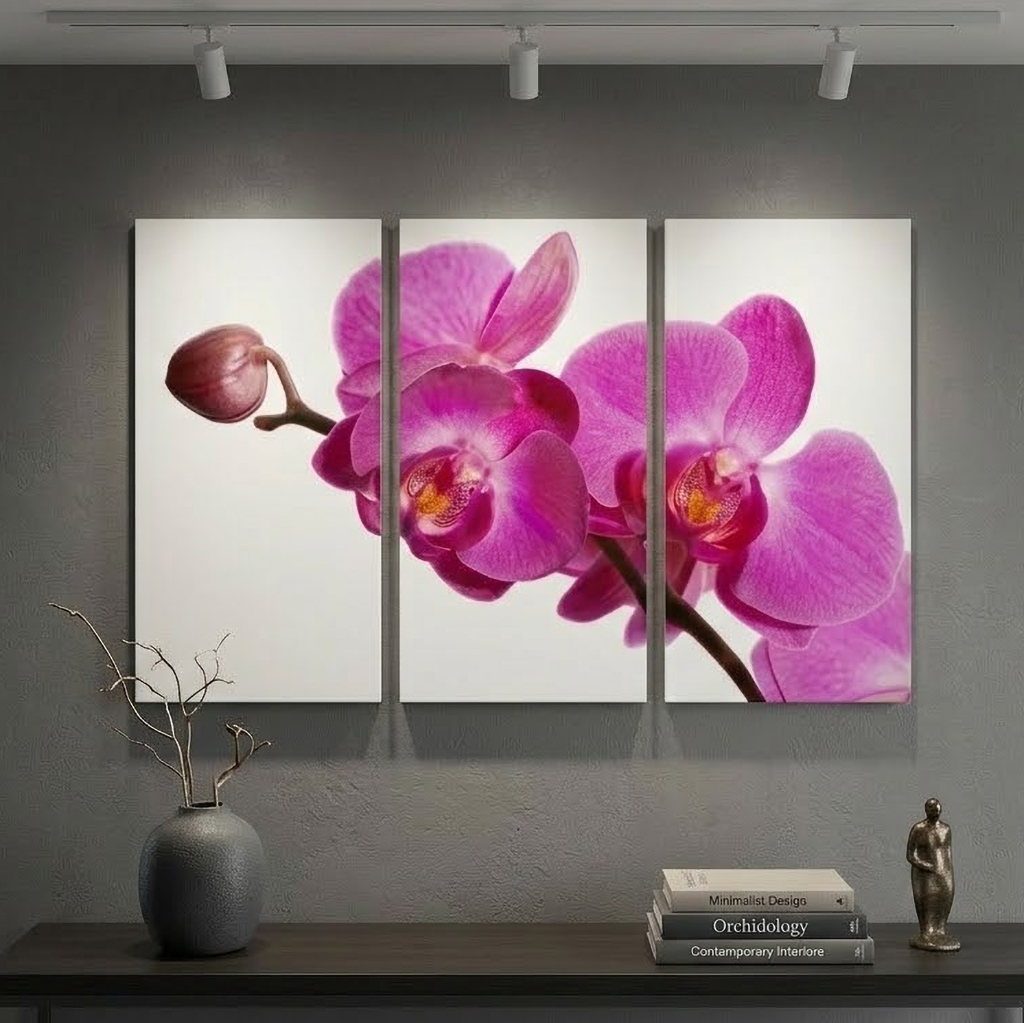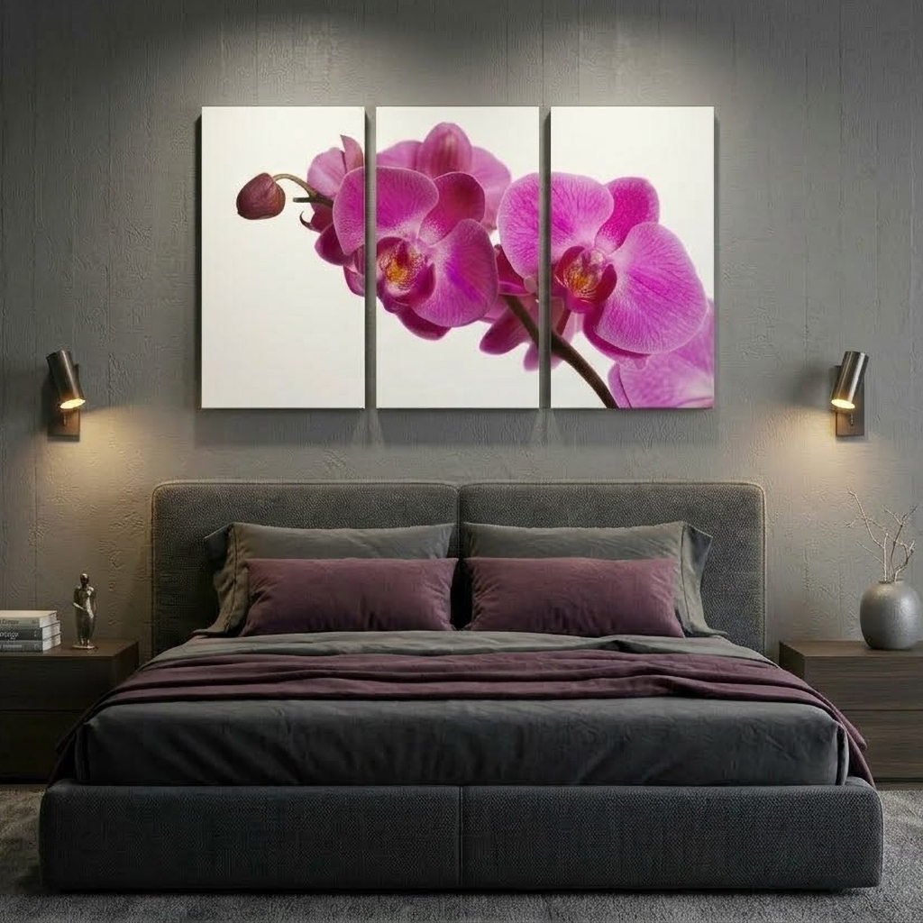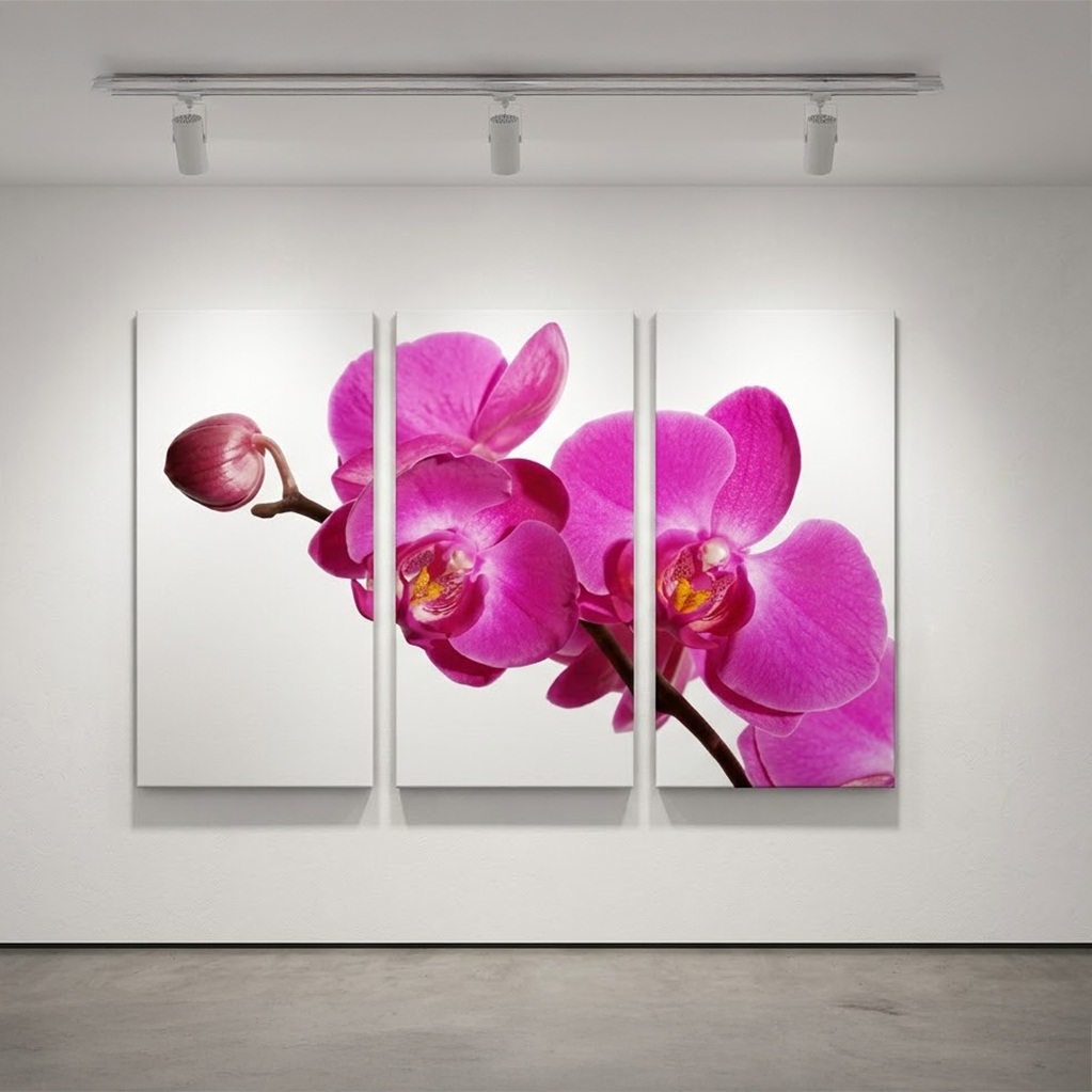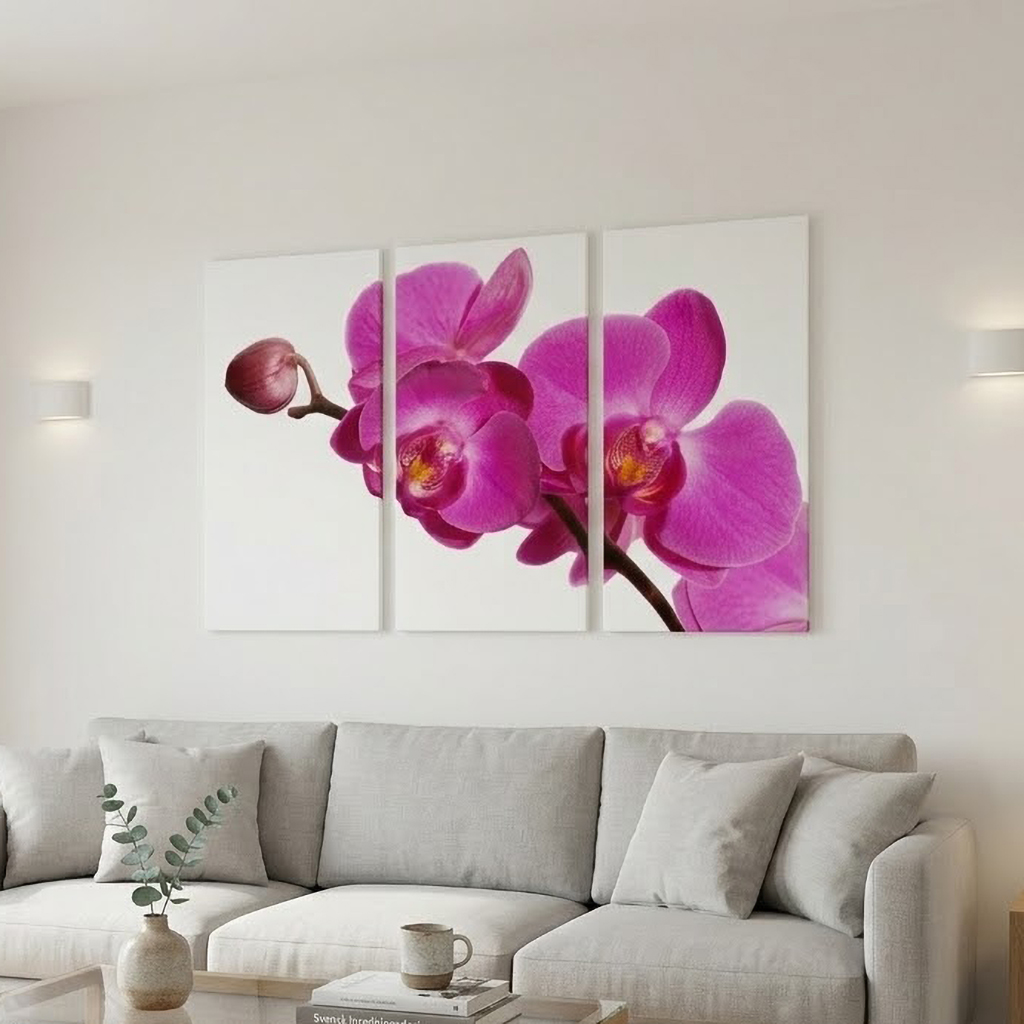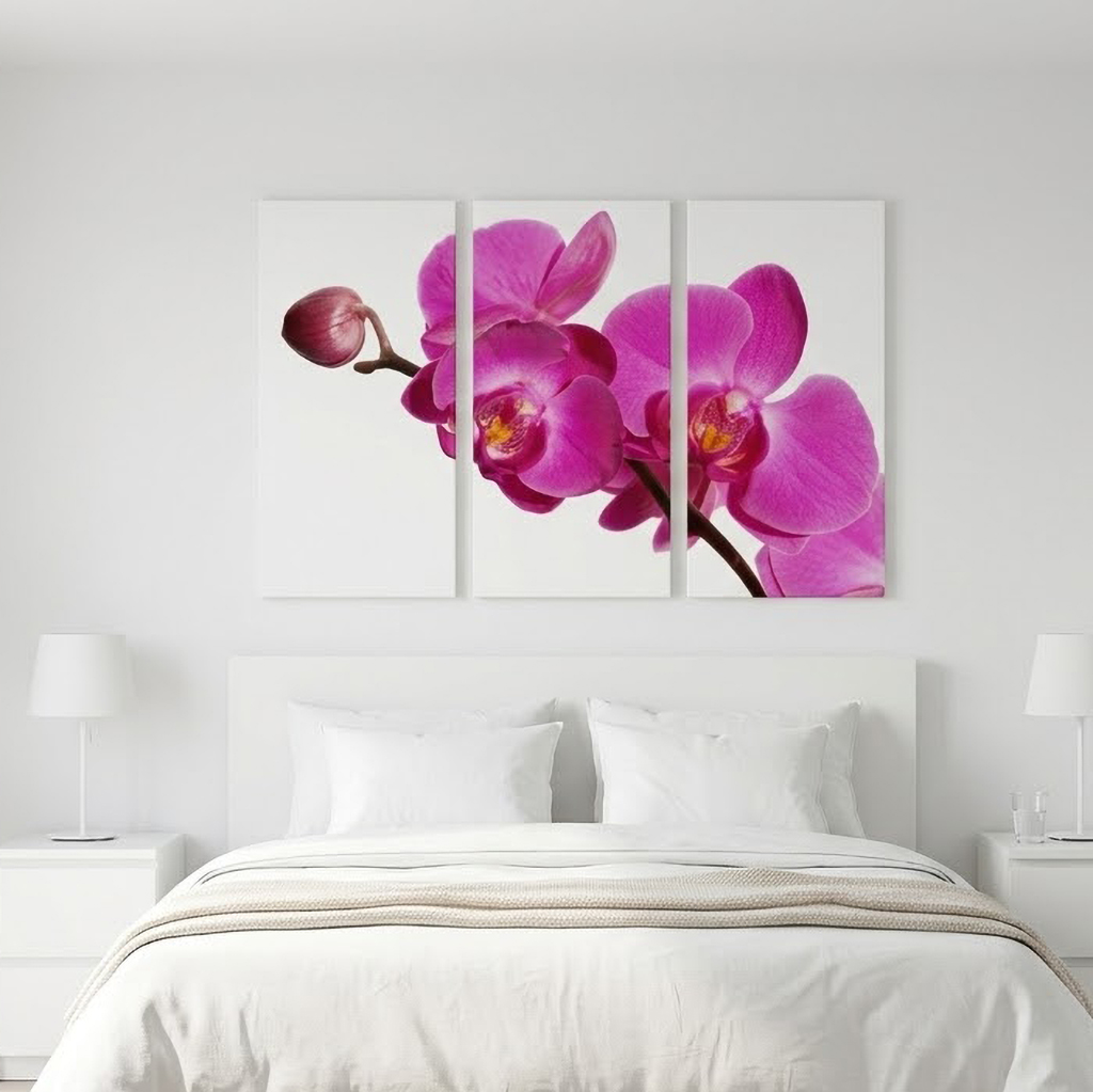Canvastavlor 3x50x100cm (Totalt 100x150cm). Alla canvastavlor är tryckta på canvasduk / målarduk och uppspända på en 4cm djup kilram, klar att hängas upp på väggen direkt! Upphängningskrokar, sågkrokar i metall ingår till samtliga canvastavlor. Välj en tilltalande orkidétavla i lila färg till någon av dina väggar.