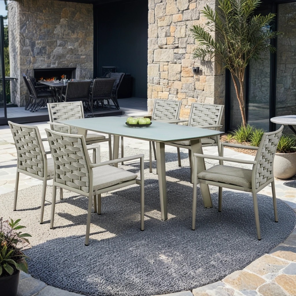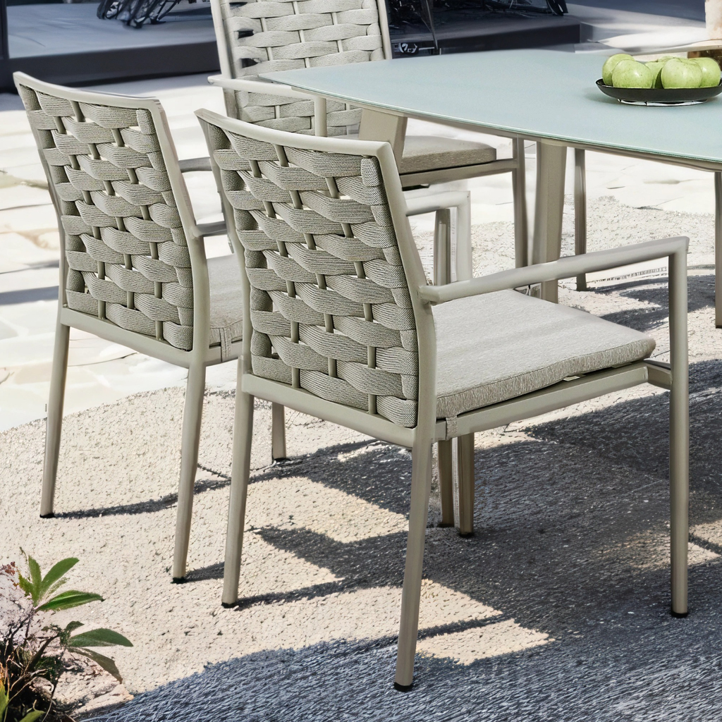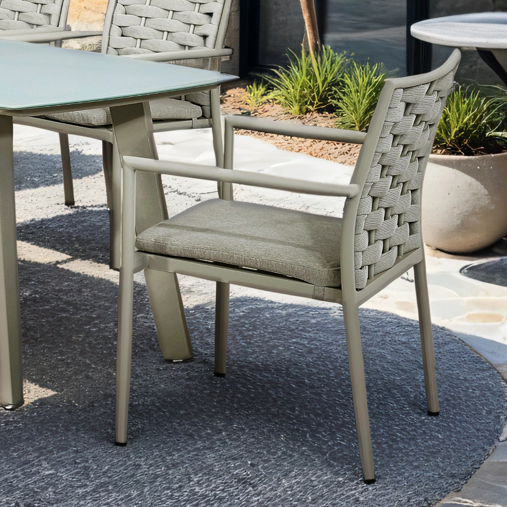 Matgruppen är tillverkad i grålackerad aluminium och kombineras med karmstolar med grå vävd polyrope samt mjuka grå dynor. Bordet har en elegant grå härdad glasskiva som ger ett luftigt och modernt uttryck samtidigt som den är praktisk och lätt att rengöra.
