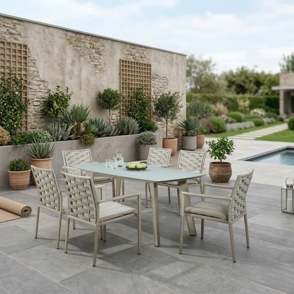 Matgruppen består av sex ergonomiskt utformade karmstolar och ett rymligt bord med gott om plats för familj och vänner. De väderbeständiga materialen gör möbeln idealisk för utomhusbruk, samtidigt som den behåller sitt stilrena utseende över tid.