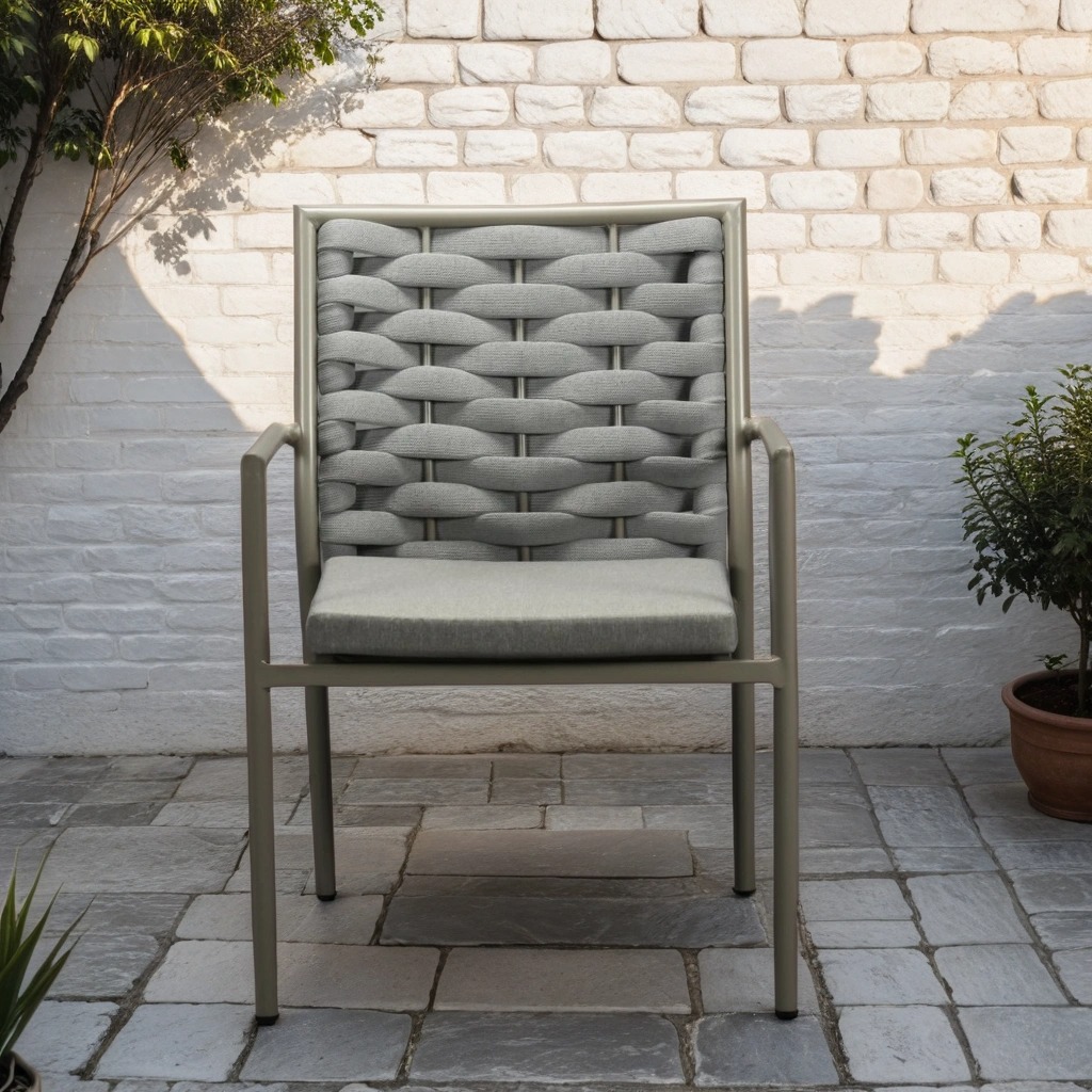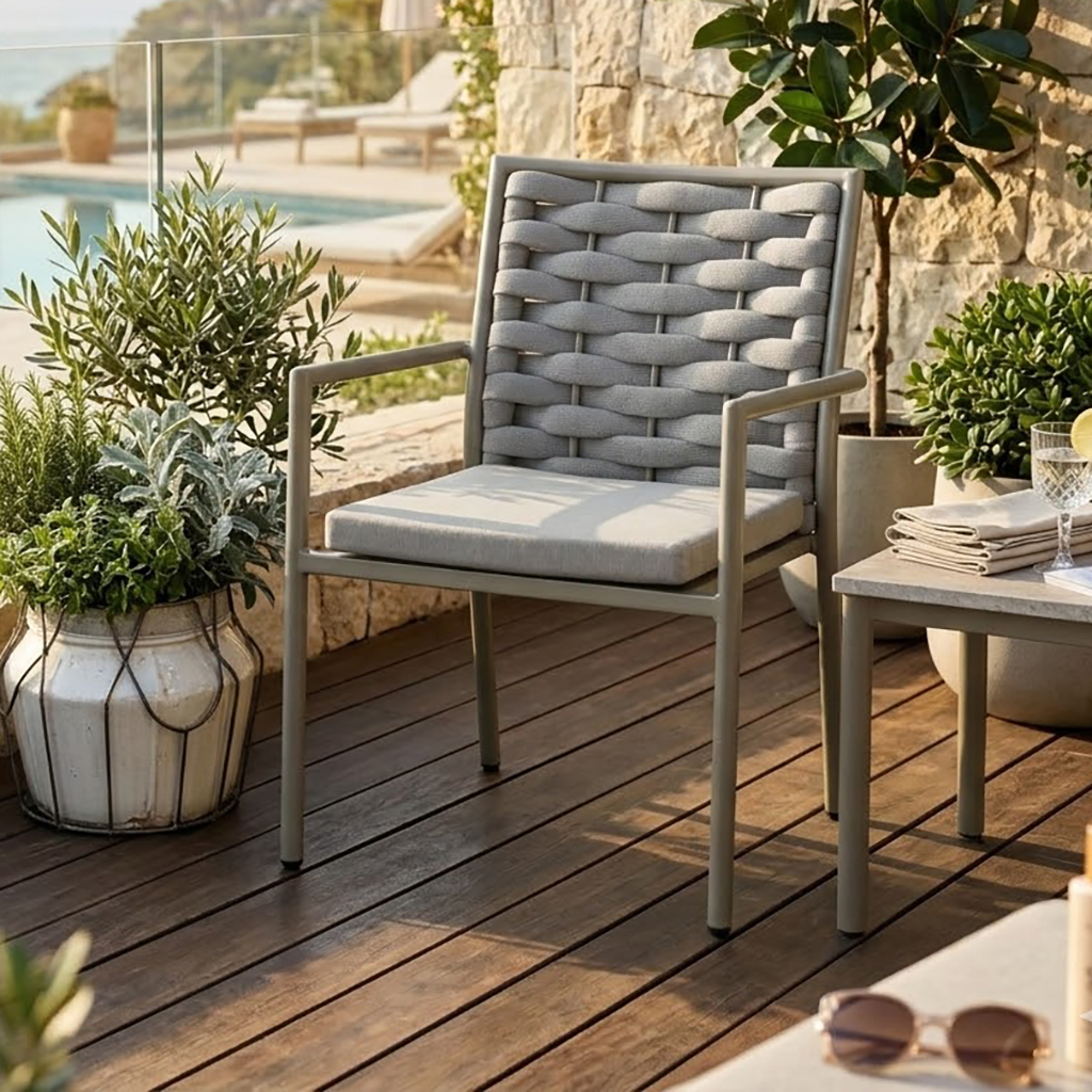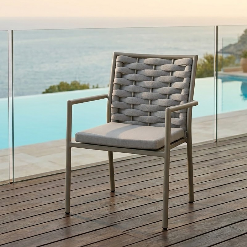 Dynorna är klädda i vattenavvisande och smutsavstötande Olefintyg, som snabbt torkar och håller sitt fräscha utseende över tid. Under dynorna finns en tålig ribbad aluminiumsits som ger extra stöd, medan de mjuka, grå dynorna skapar en lyxig och inbjudande sittupplevelse.