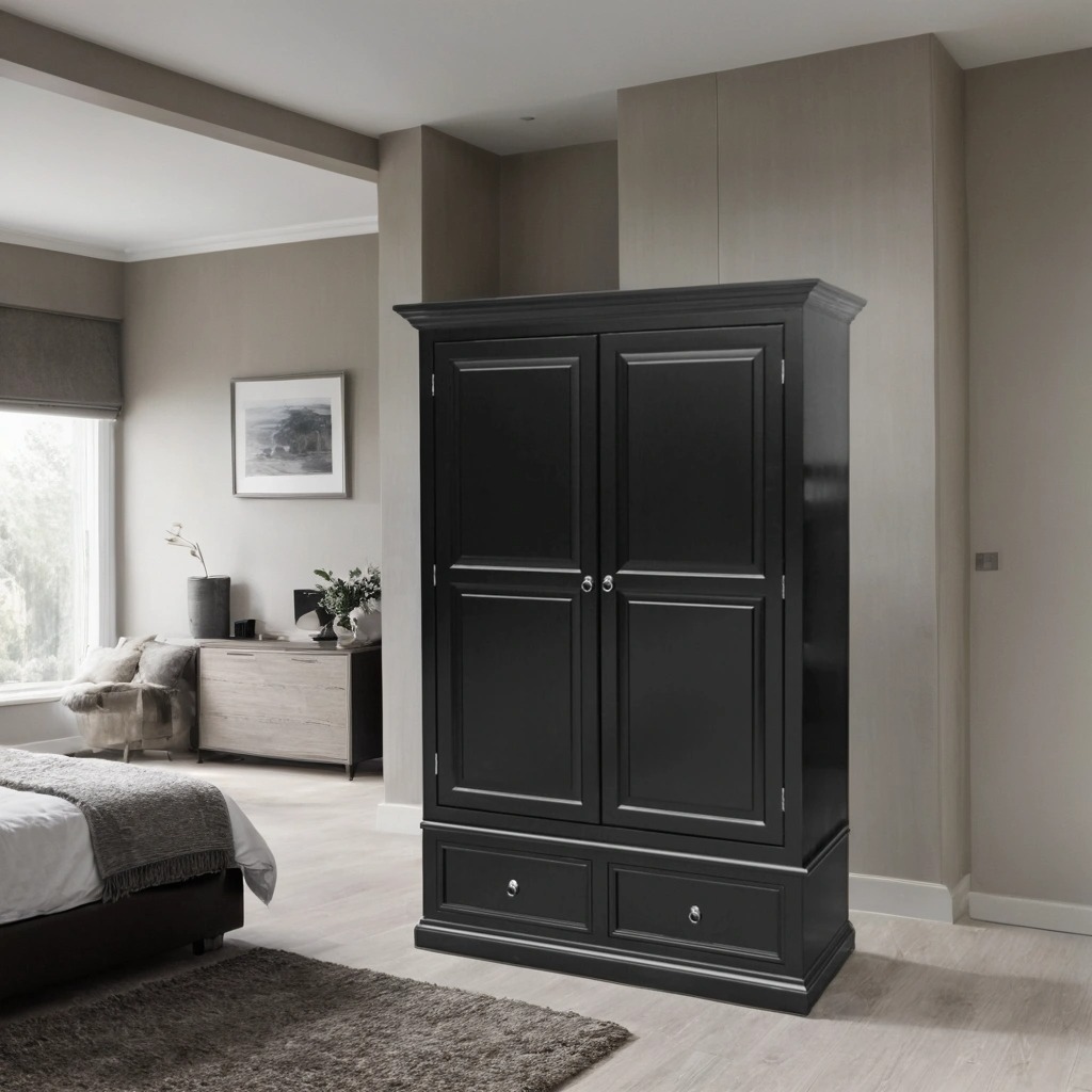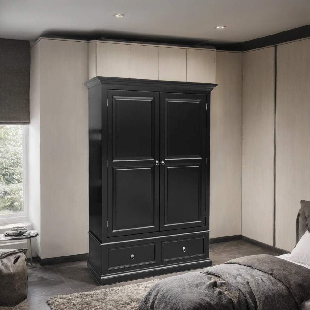 Två dörrar och två lådor, klädstång upptill på högersidan och fyra hyllplan på vänstersidan. Praktisk garderob med fina detaljer, snygga utanpåliggande gångjärn och handtag i silversvart metall, magnetlås på dörrarna. Stor garderob för den som behöver mycket förvaring av kläder, skor och andra saker.