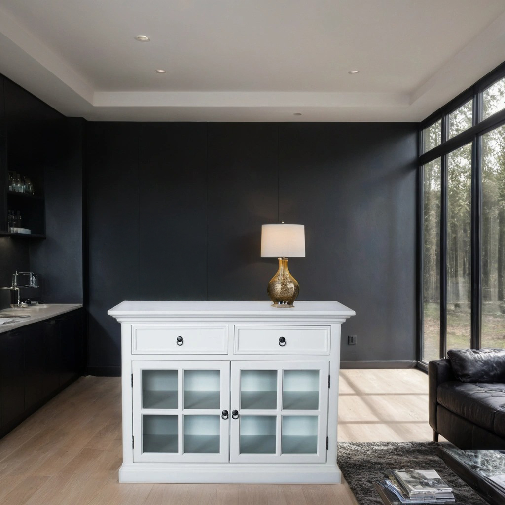 Snygg Skänk i vitt med två lådor och dörrar, klarglas. Ett hyllplan bakom dörrarna.Bredd 120x Djup 45x Höjd 90cm.Vikt 46 kg.