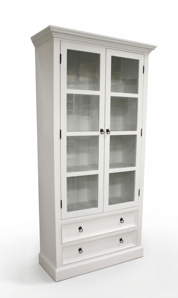Snyggt Vitrinskåp i vitt med två glasdörra och två lådor.
