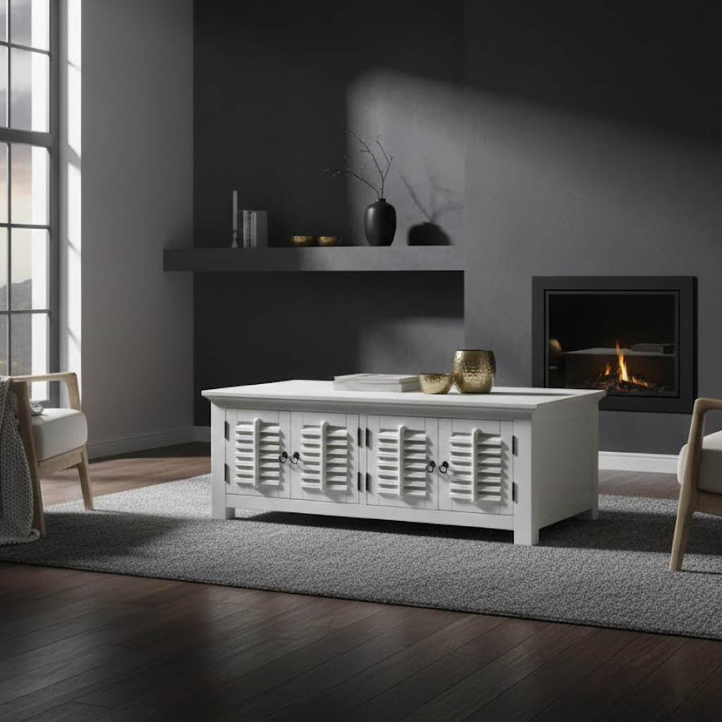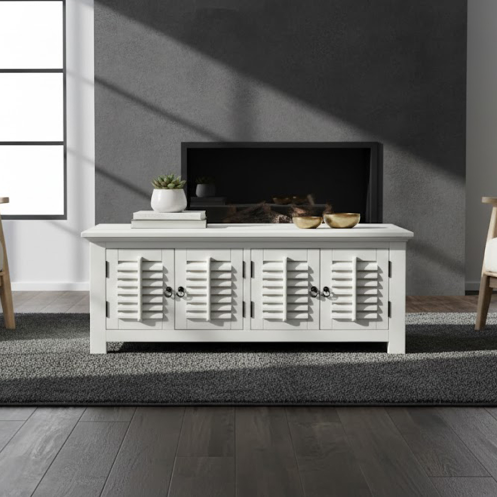 Soffbordet San Jose Vit är en stilren möbel med en modern och praktisk design och jalusidörrarna förmedlar en marin känsla som andas hav och kust. Detta soffbord är tillverkat av massivt akaciaträ och har en vit färg som skapar en fräsch känsla i ditt vardagsrum. De dubbla jalusidörrarna på båda långsidorna ger dig gott om förvaringsutrymme, vilket är perfekt för att hålla dina tidningar, fjärrkontroller och andra vardagsrumsprylar organiserade.
